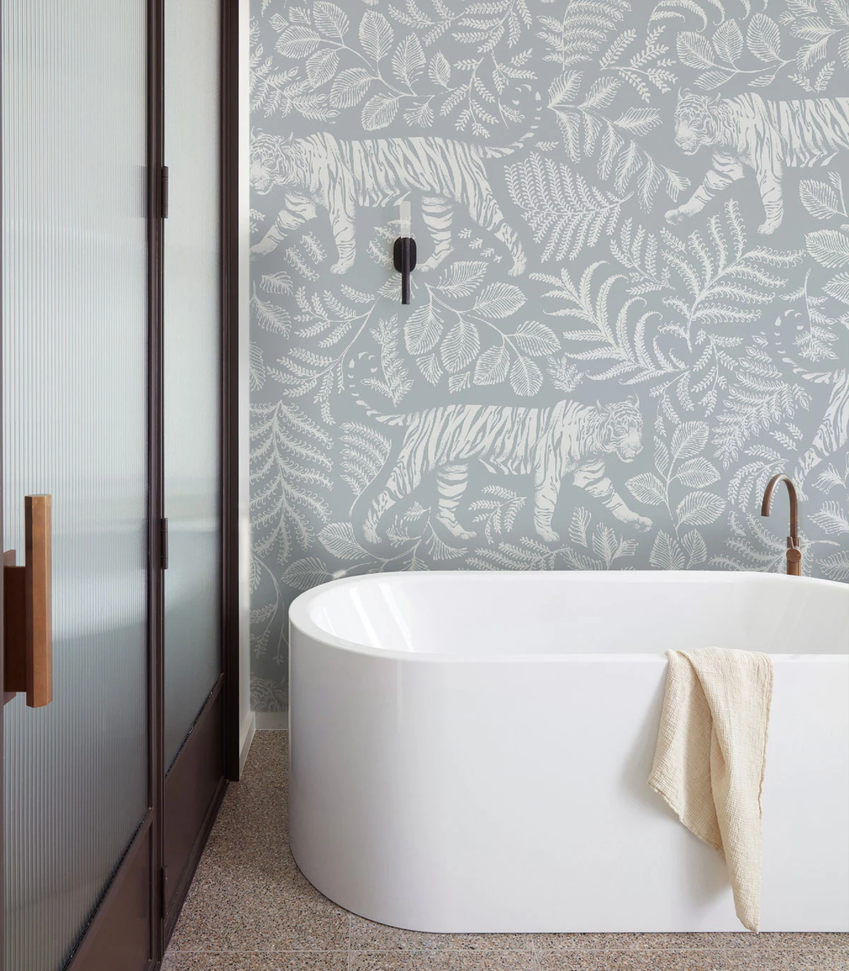 Die Tapete Camouflaged Tiger Blue ist eine einzigartige Wanddekoration, die zarte Blautöne mit eleganten Mustern von in dichter Vegetation verborgenen Tigern kombiniert. Diese Tapete bringt einen Hauch von Exotik und Abenteuer in die Innenräume und eignet sich perfekt für Kinderzimmer, Wohnzimmer und moderne Badezimmer. Die Kombination aus natürlichen Motiven und subtilen Farben macht das Interieur einzigartig und inspirierend.
