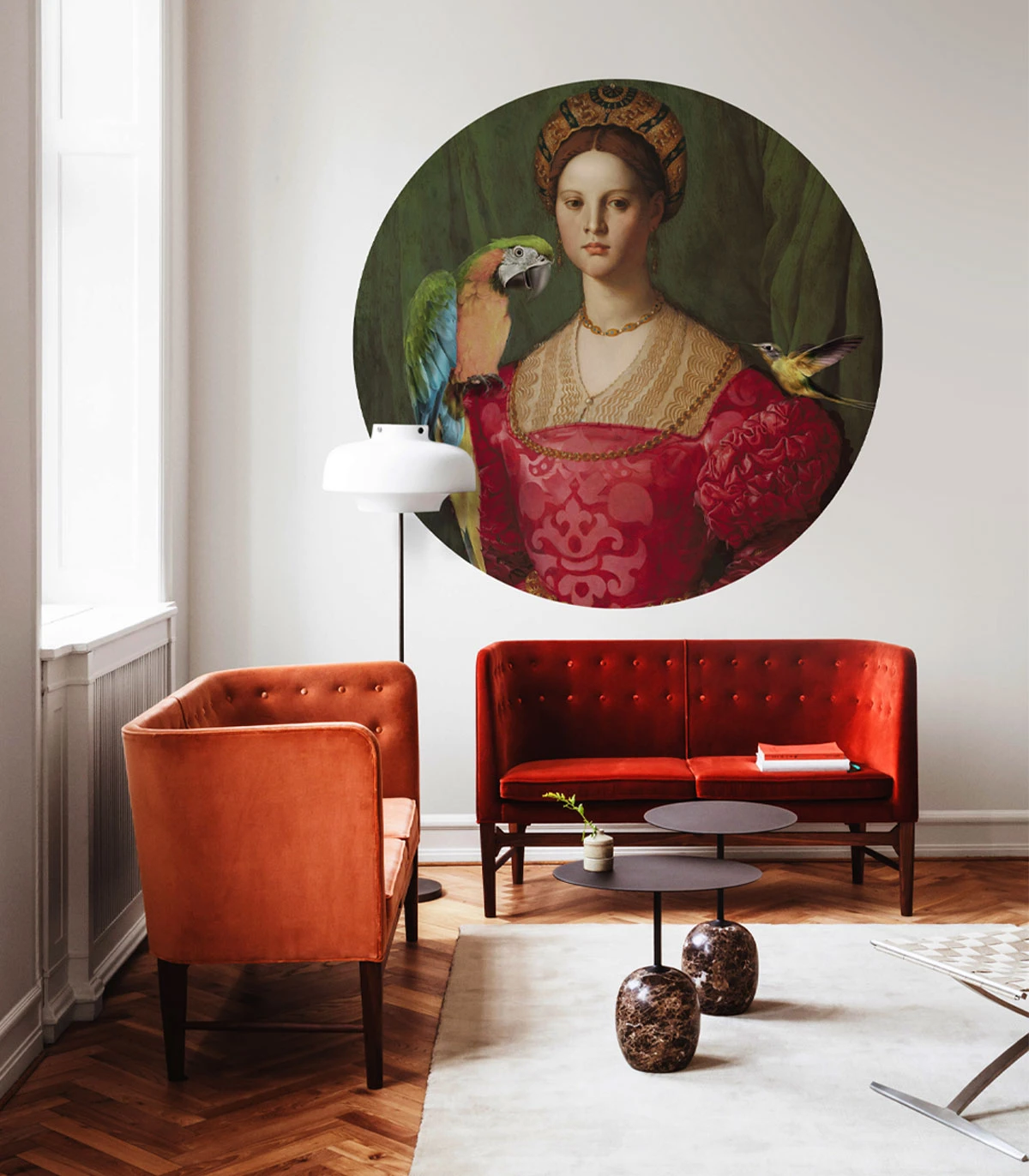 Step into the Renaissance with dots - Mother of Birds, a round wall mural featuring an aristocratic lady accompanied by exotic birds. This mural will infuse your space with a touch of historical elegance and artistry.