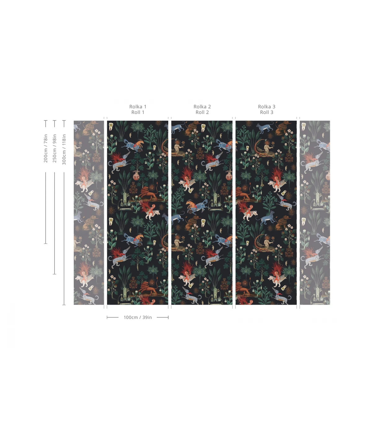 The wallpaper is not tailored to specific walls; it is typically divided into equal panels with a maximum width of 100cm / 39in. The left-side excess is 2.5cm / 1in, and the right-side excess is no less than 2.5cm / 1in, determined individually.