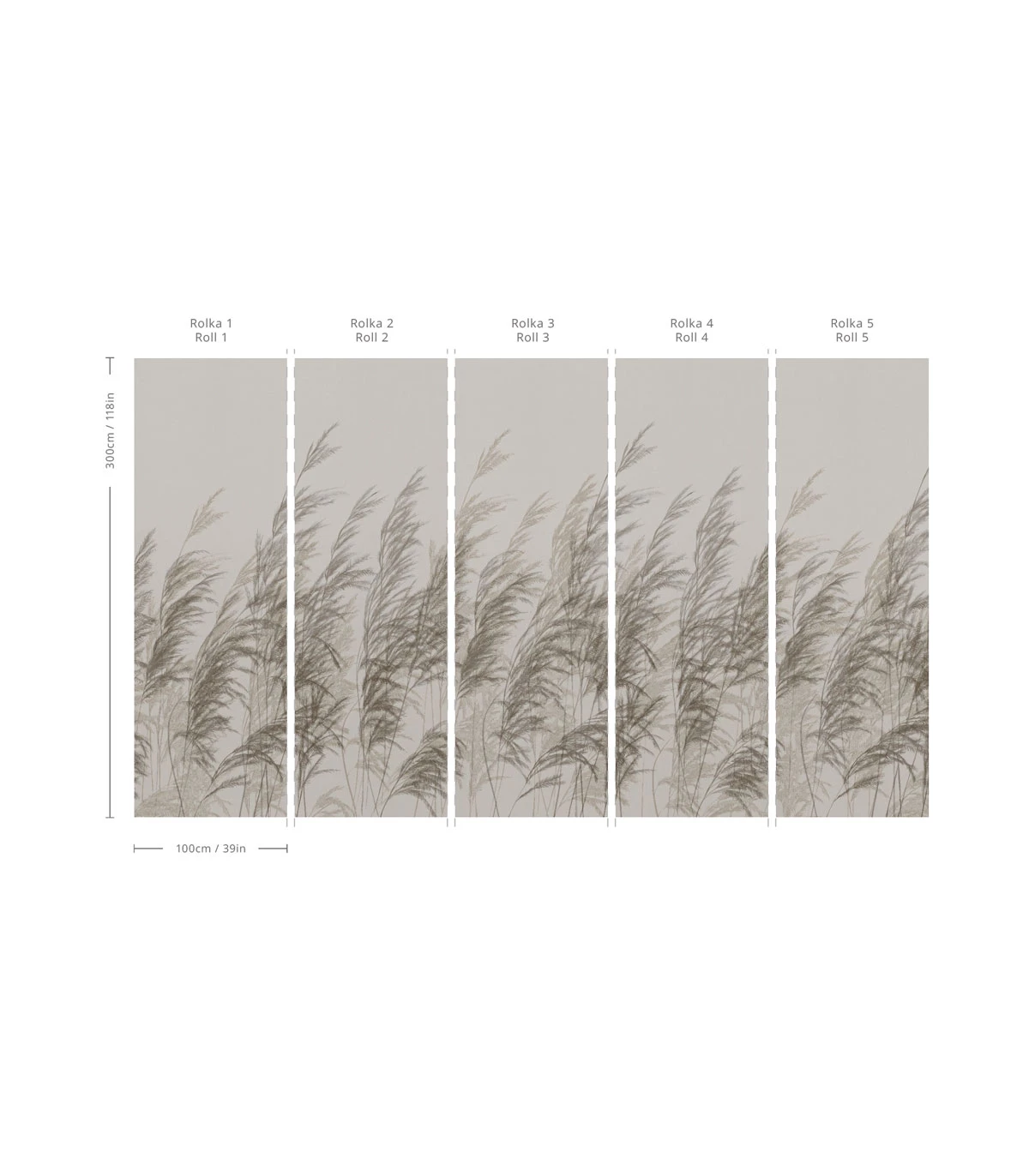 Tapeta nie jest dopasowana do poszczególnych ścian, standardowo tapeta podzielona jest na równe bryty o maksymalnej szerokości 100cm / 39in. Nadmiar z lewej strony to 2,5cm / 1in, nadmiar z prawej strony jest nie mniejszy niż 2,5cm / 1in, ustalany indywidualnie.
