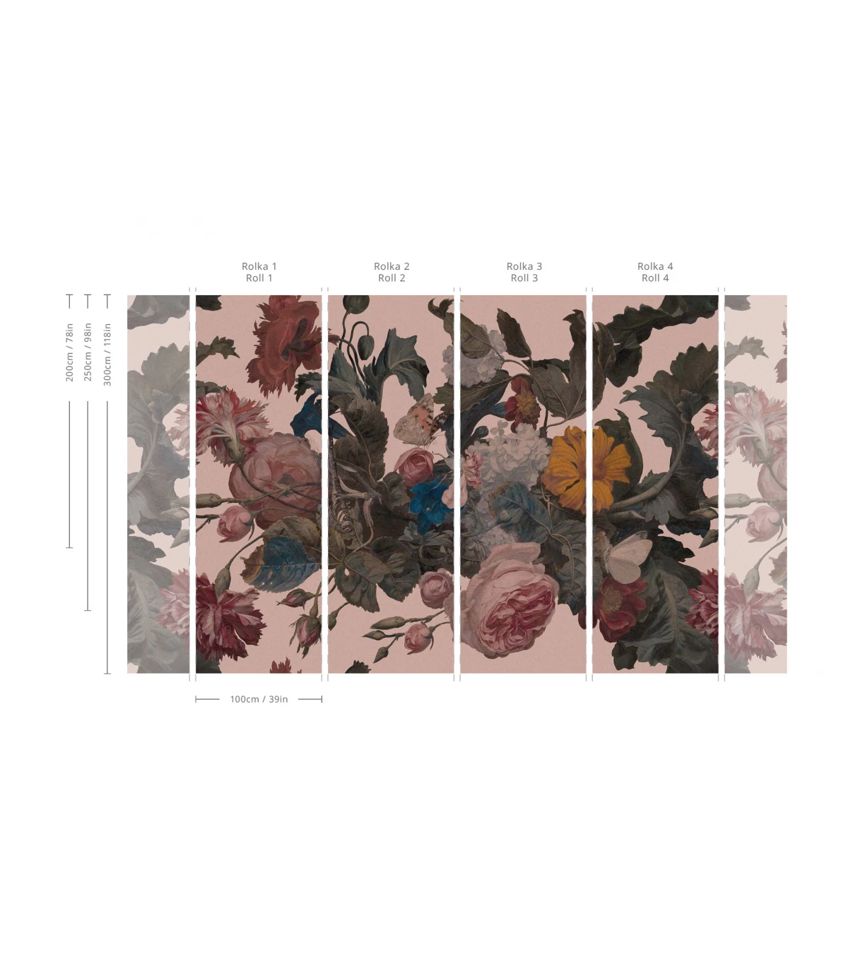 Tapeta nie jest dopasowana do poszczególnych ścian, standardowo tapeta podzielona jest na równe bryty o maksymalnej szerokości 100cm / 39in. Nadmiar z lewej strony to 2,5cm / 1in, nadmiar z prawej strony jest nie mniejszy niż 2,5cm / 1in, ustalany indywidualnie.