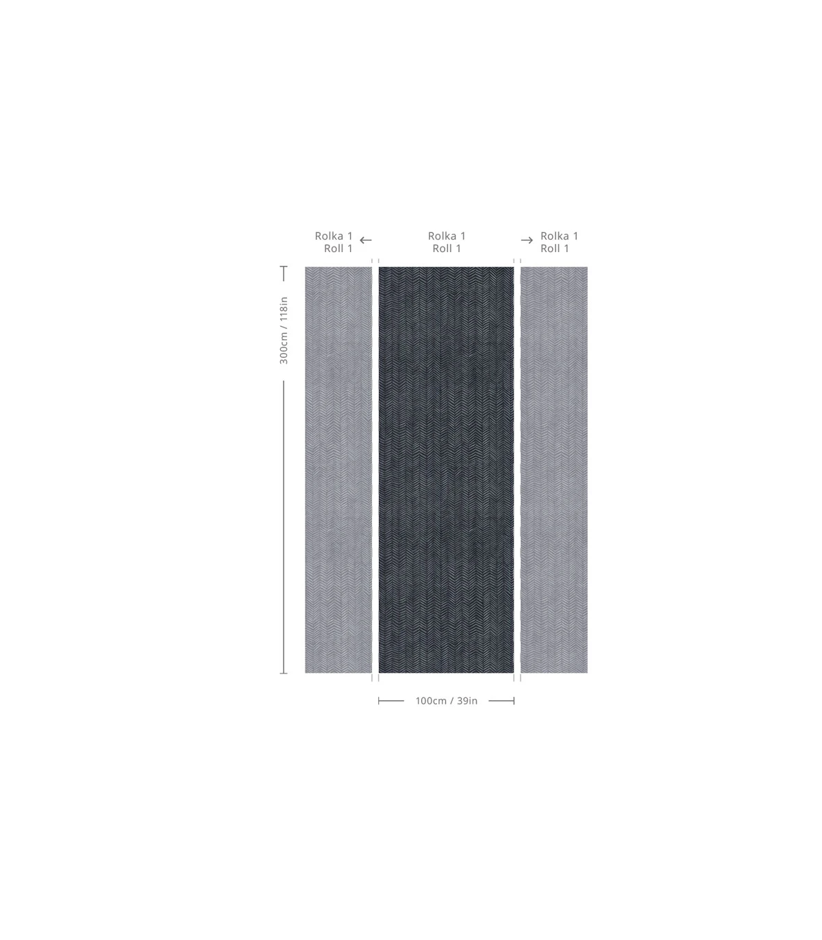 Tapeta nie jest dopasowana do poszczególnych ścian, standardowo tapeta podzielona jest na równe bryty o maksymalnej szerokości 100cm / 39in. Nadmiar z lewej strony to 2,5cm / 1in, nadmiar z prawej strony jest nie mniejszy niż 2,5cm / 1in, ustalany indywidualnie.